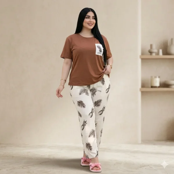 بخامة ناعمة وقصّة مريحة، هذا الطقم مثالي للاستخدام المنزلي أو الخروجات الخفيفة، حيث يجمع بين البساطة والذوق الراقي في كل تفصيلة.